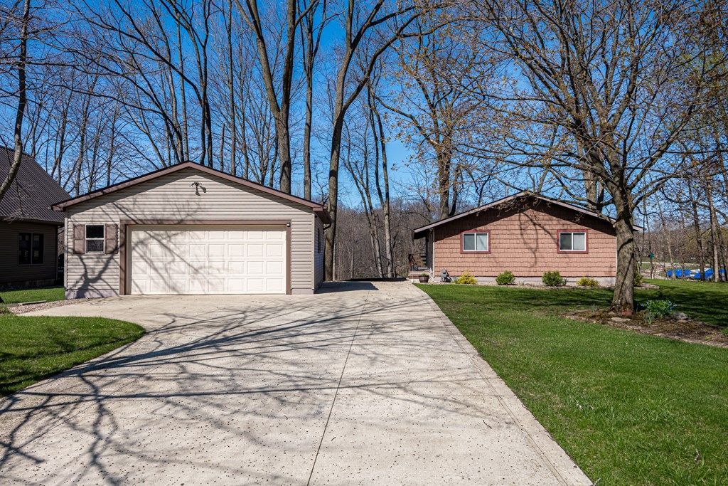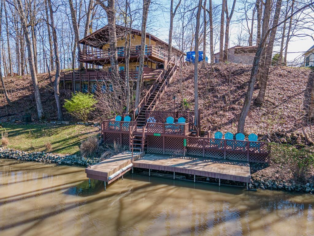 This beautiful, nearly 3,000 square foot cottage-style lakefront home features a picturesque view of the lake from two large, entertainer's decks located on both the upper and lower levels. An open floor plan with an island kitchen, dinette, and living room features a wood beam cathedral ceiling and, as the centerpiece, a newly installed, stone-wrapped woodburning fireplace. Luxury LVT vinyl flooring is located throughout the house. Also on the first floor are 2 bedrooms and a full bath. The newly renovated, walkout lower level features a large family/recreation room with full wet bar, as well as a full kitchen, two dining areas, and an additional bedroom and full bath. Steps from the lower-level lead down to the private boat dock. Newer items include all kitchen appliances, central air conditioning, roof, gas furnace, lower-level deck, and retaining wall. A 2-car detached garage, storage shed, beautiful landscaping and a concrete drive round out this must-see property! Come enjoy livi